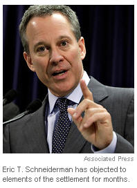 Mr. Schneiderman and top prosecutors in some other states have objected to the proposed settlement with major banks, saying it would restrict their ability to investigate and prosecute wrongdoing in a variety of areas, including the bundling of loans in mortgage securities.
