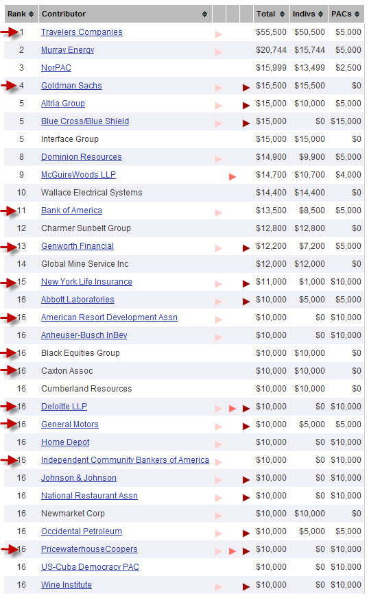 Rep. Eric Cantor’s (R – Virginia) campaign donations – Top 20 for 2011-2012: