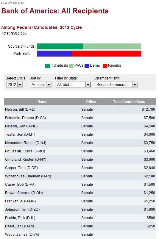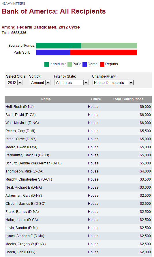 The Democrats are the first focus because they know Bank of America is living off of public money. It doesn’t take a rocket scientist to see that BofA stock is rolling downhill and the bank is unstable. Taking donations from an idiot bank on the edge is ludicrous – but knowing it is public money is nearly criminal. If you see your candidates on this list – call their offices and tell them to “Give It Back” – all of the Bank of America and Wall Street campaign donation money – or you, your family and friends are not voting for them. Wall Street can’t be reformed by politicians beholden to the banks!
