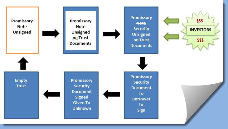 Think of it this way. The application for a loan turns into unsigned or hypothetical loan documents that are identified inside the Trust to attract investors’ approval to fund the Trust – i.e., pay for the loans. The Trust is or was already created. The promissory note is identified on paper printed in the trust documents. Once the note is in the Trust, it becomes a security. The investors funds are applied and the loan documents (mortgage and promissory note security) are then provided for the borrower to sign and whisked away (God, only knows where). The mortgage got recorded and the note – well… the note does not appear again, if then – until default and foreclosure.