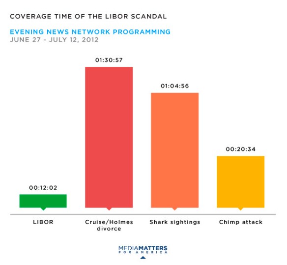 Instead of covering one of the largest banking scandals in history, American television news outlets have focused on the divorce of Tom Cruise and Katie Holmes, shark sightings, and a chimpanzee attack.