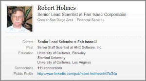 Robert Holmes brief bio at linked in states the following: “My educational background is in Mathematics and Statistics. My experience over the last 10 years at HNC and FICO has been in developing predictive models for financial services; credit & fraud risk models, first and third party application fraud models and internet/online banking fraud models.” [Ed. Note: Remember the patents…??]