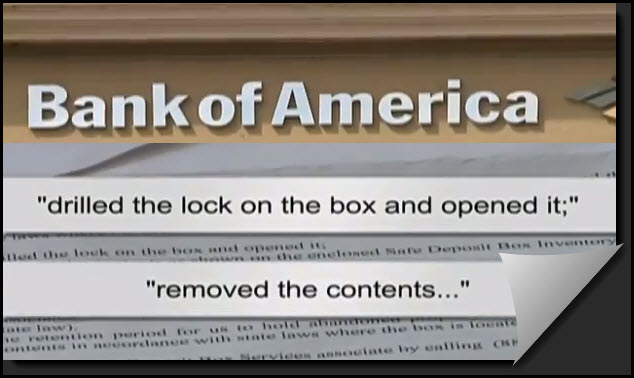 Foreclosure victim know just how invasive these banksters can be. Is it even a wonder that they would break into your safe deposit box when we know they trespass on your property and break into your home? Amazing that the bank had their mailing address, certainly a phone call or letter BEFORE Bank of America raided the safe deposit box would have been more appropriate. Apparently, these bank boxes can’t be called “safe” anymore.