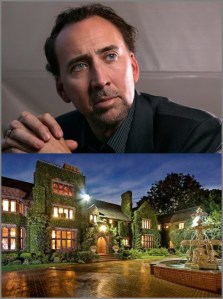 Nicolas Cage, Actor: 363 Copa De Oro Road, Los Angeles, Calif. Purchases from Tom Jones in 1998 for $6.5 million. In October 2006 Cage listed his almost 12,000 sq ft house (7 Beds and 9 baths) for $35 Million. Doesn’t sell.