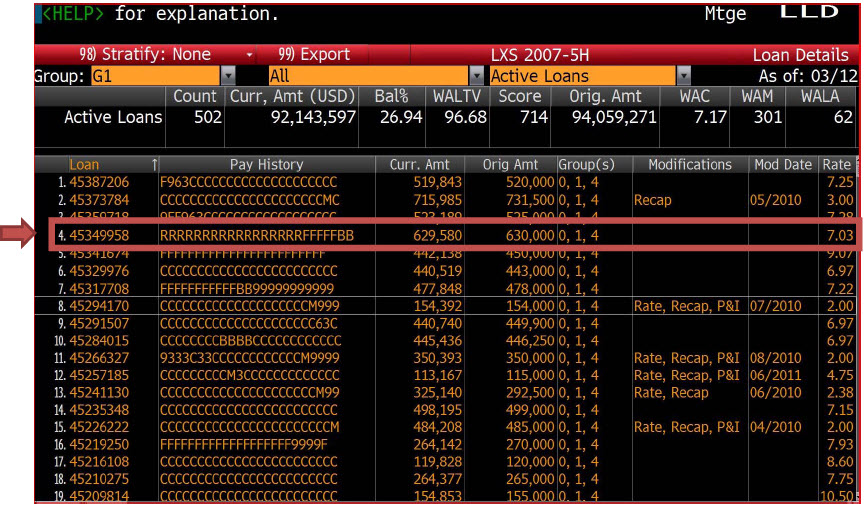 Homeowners have become more savvy theses days and many are asking to find their loans before they are in default. Since the banks have been less than forthcoming, forensic auditors and attorneys began using Bloomberg Terminal to research the trust location of loans. While your name and address do not appear in Bloomberg Terminal, your loan information may be available, such as your loan number (although many times the banks have changed the original loan numbers), your credit score, the amount of your original loan payment, interest rate, zip code, amount and date of your mortgage – enough information to pretty accurately pinpoint the alleged loan that is actively trading…Yes, actively trading. Maybe even portions of it has been paid off.