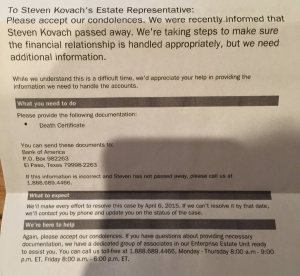 The second letter I opened was another one from Bank of America apologizing for the first letter and assuring me I’m still alive.