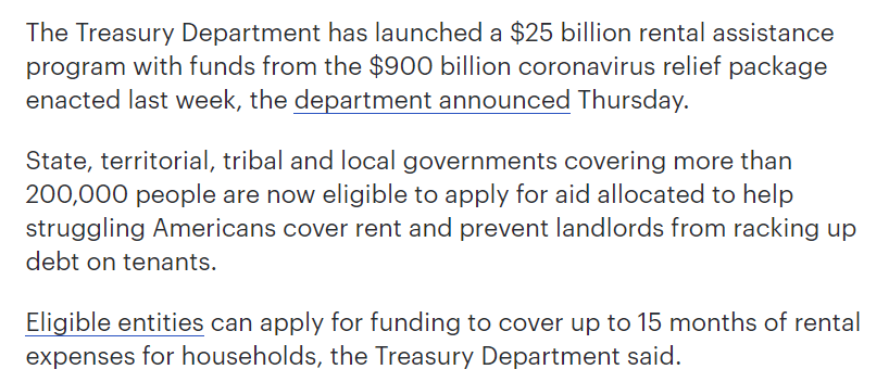 January 7, 2021: Treasury launches $25B coronavirus rental assistance program