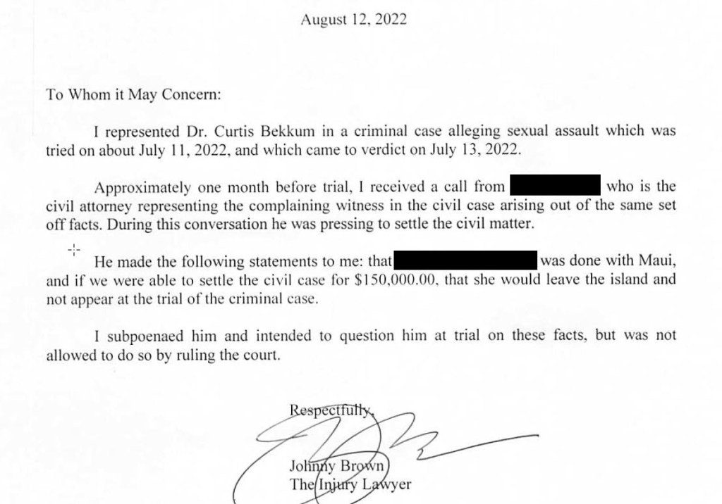 About a month before the trial, the woman’s lawyer, contacted Dr. Bekkum’s attorney pressing harder to make a deal. Dr. Bekkum’s former attorney provided a letter for proof after the trial that reads: