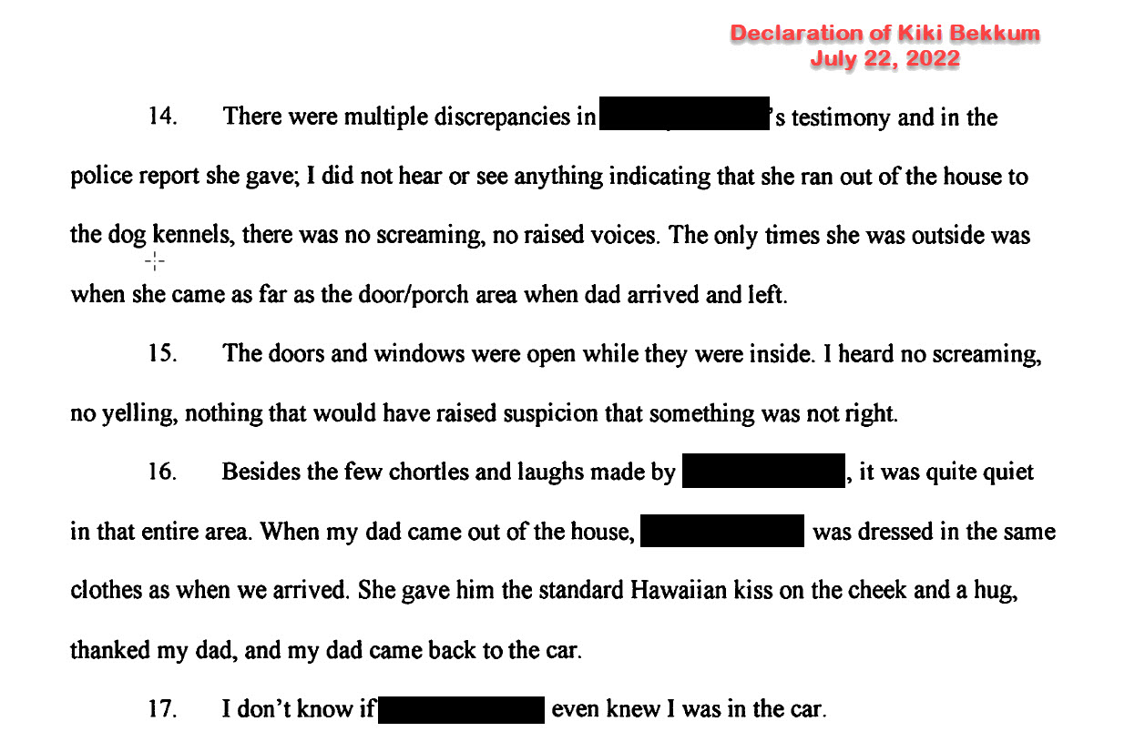 There were multiple discrepancies in the woman’s trial testimony and in the police report she gave. Dr. Bekkum’s daughter provided the court with a declaration after the trial and stated she did not hear or see anything indicating that the woman ran out of the house to the dog kennels as the woman had testified under oath; that there was no screaming, no raised voices as the woman claimed in the police report. The only time the woman was outside was when she came as far as the door/covered lanai area as Dr. Bekkum arrived and left. It became apparent through the woman’s testimony that she thought she was alone; the woman didn’t know there was a witness.