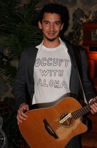 Makana had been invited to play instrumental music at the gala dinner Saturday night. At the dinner, Makana opened his jacket to reveal a t-shirt which read, “Occupy with Aloha.”